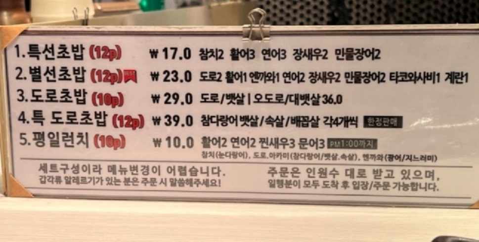 가격대: 도로초밥 29,000원, 별선초밥 스페셜 23,000원, 특선초밥 레귤러 17,000원 등