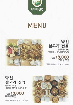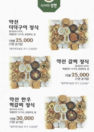약선 튀김류, 약채 샐러드, 약초 묵요리, 잡채요리, 계절반찬 12가지, 된장찌개, 양념게장, 유기농쌈, 약선더덕구이, 잡채요리 블루베리 돌솥밥 변경 시 3000원 추가